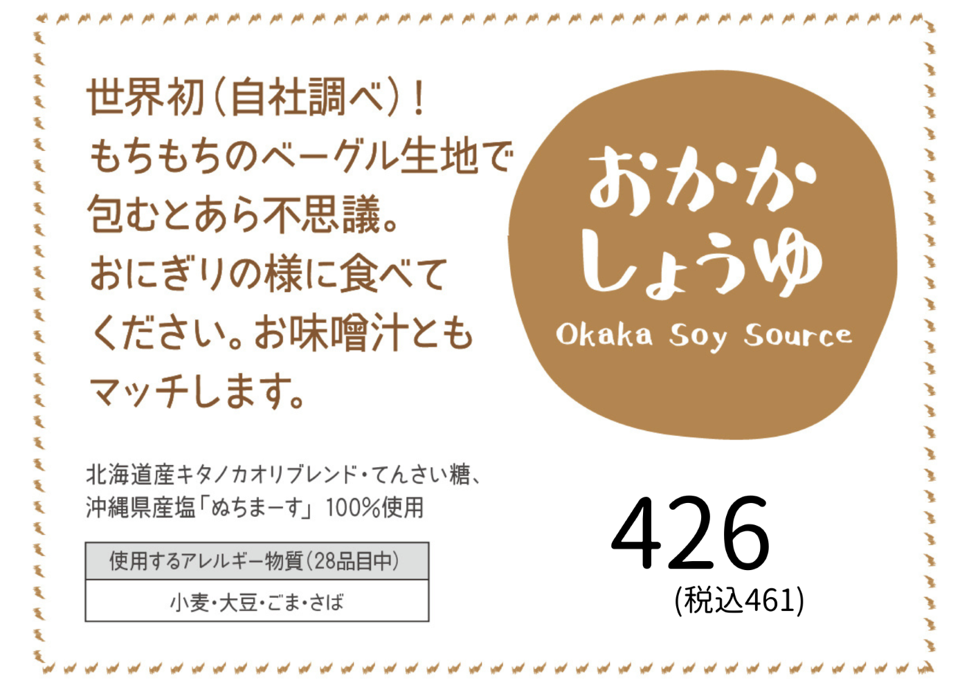 小麦粉(小麦(北海道産))、甜菜糖(甜菜(北海道産))、混合削り節(サバ、ムロアジ、カツオの節)、ごま、醤油(大豆を含む)、塩(沖縄県産)、パン酵母