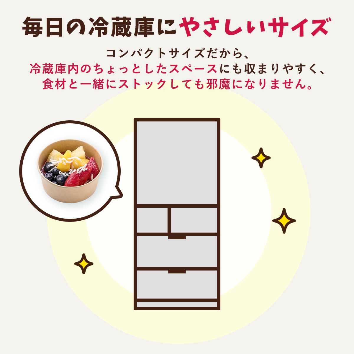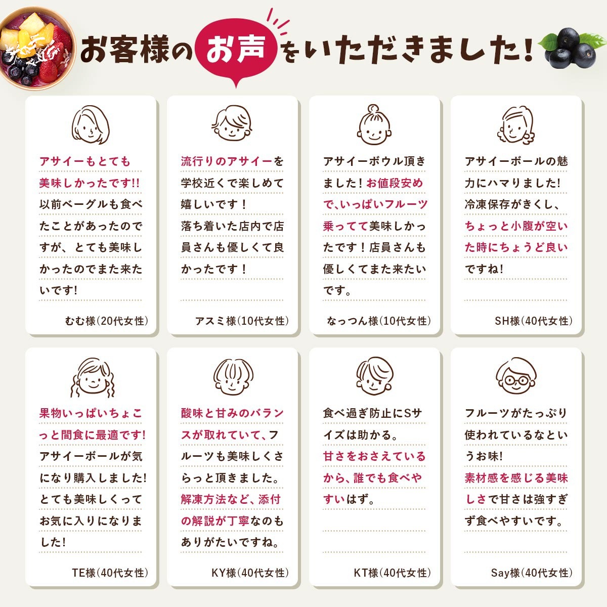 【アサイーボウル】バナナ(バナナを含む)、イチゴ、パイナップル、ぶどう濃縮果汁、りんご濃縮果汁(りんご含む)、牛乳(乳成分を含む)、アサイーピューレ、マンゴー濃縮果汁、・ブルーベリー、ココナッツ、粉あめ、こんにゃく粉/香料、レシチン(大豆由来)