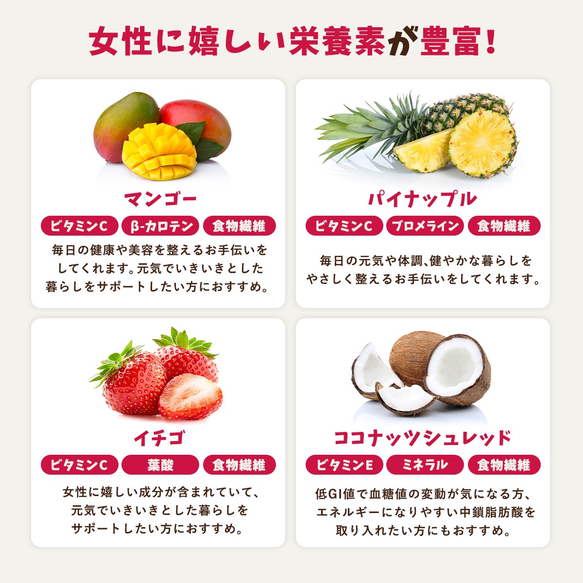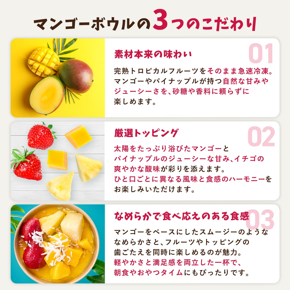【マンゴーボウル】マンゴー、バナナ(バナナを含む)、牛乳(乳成分を含む)、パイナップル、イチゴ、りんご、粉あめ、こんにゃく粉/酸化防止剤(ビタミンC)、香料