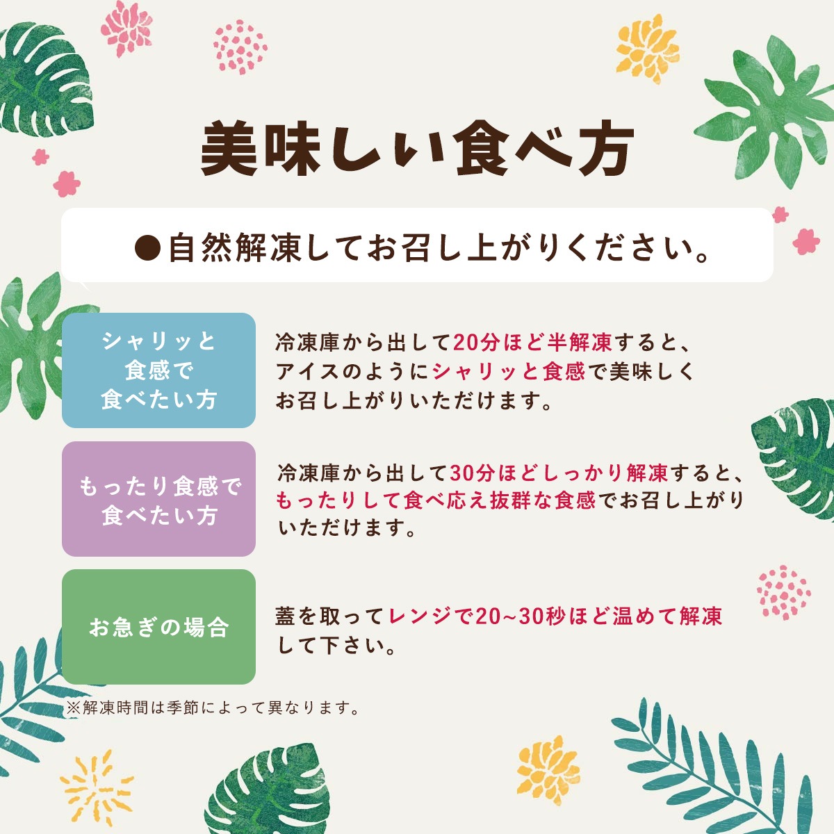 冷凍庫から出して20~30分ほど解凍してからお召し上がりください。