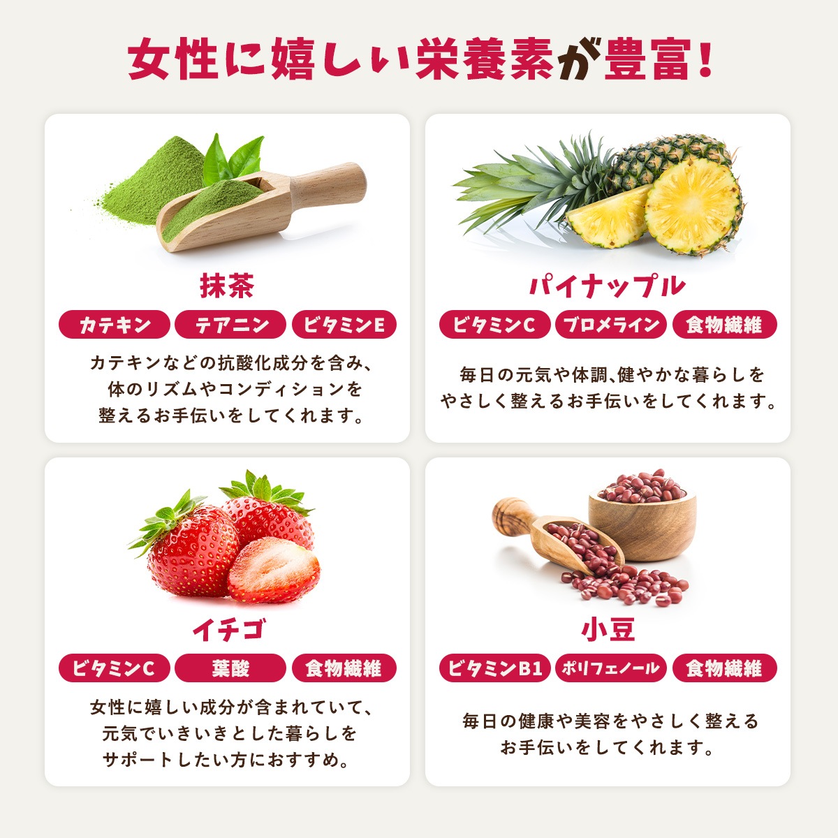 【抹茶ボウル】バナナ(バナナを含む)、牛乳(乳成分を含む)、イチゴ、パイナップル、小豆(北海道産)、砂糖、還元水飴、マルトオリゴ糖(国内製造)、もち米粉、でん粉、抹茶(京都府産)、粉あめ、こんにゃく粉/ソルビトール、加工でん粉、乳化剤、酸化防止剤(ビタミンC)