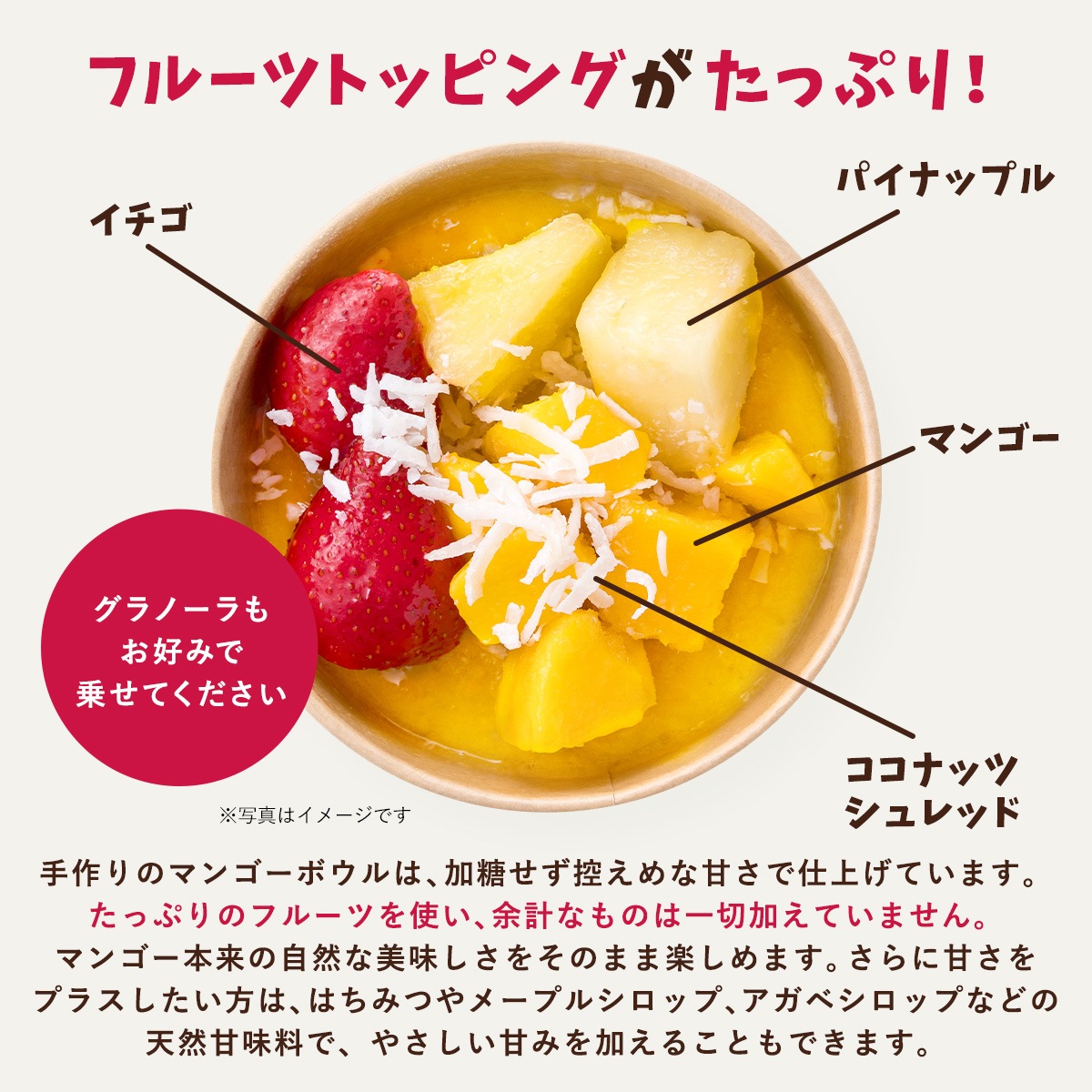 【マンゴーボウル】マンゴー、バナナ(バナナを含む)、牛乳(乳成分を含む)、パイナップル、イチゴ、りんご、粉あめ、こんにゃく粉/酸化防止剤(ビタミンC)、香料